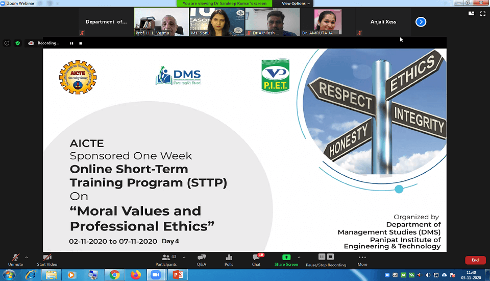 Department of Management Studies achieved a milestone by receiving a grant of Rs.3 lakhs from AICTE to organize STTPs on “Moral Values and Professional Ethics”. Department had organized three AICTE sponsored STTPs of one week each where 250 participants across the country were the part of it.