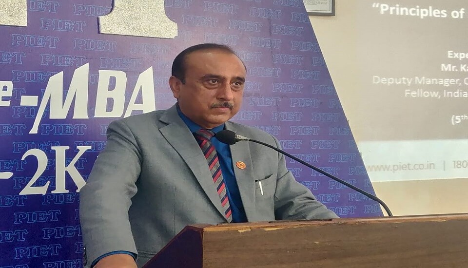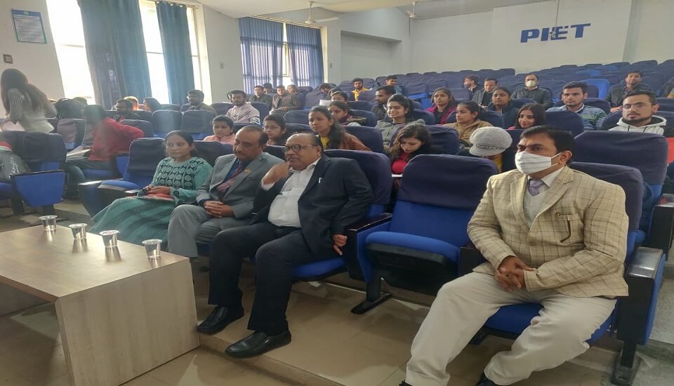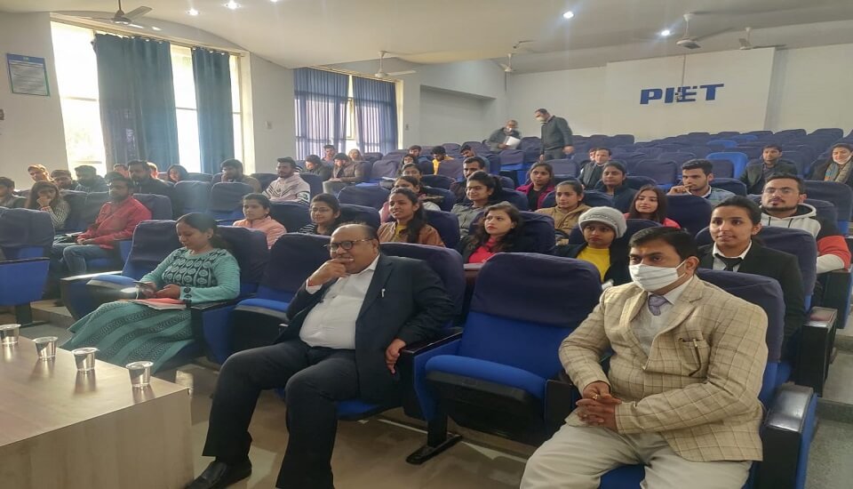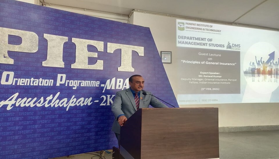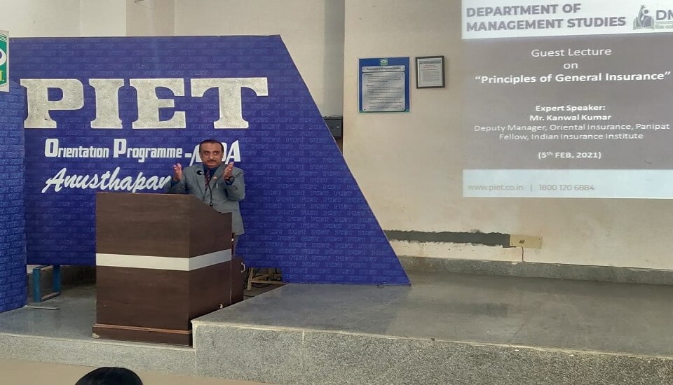 The Department of Management Studies (DMS) organized a guest lecture on Principles of General Insurance by Mr. Kanwal Kumar (Deputy Manager, Oriental Insurance Panipat). The session was joined by Shri Suresh Tayal (Chairman, PIET), Prof. R C Sharma (Professor, DMS), faculty members of DMS and students of MBA 1st year.