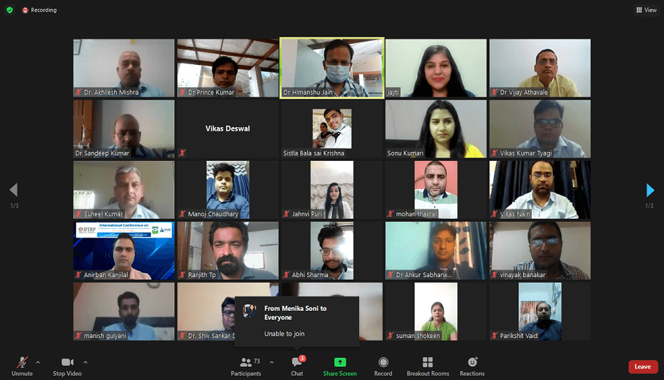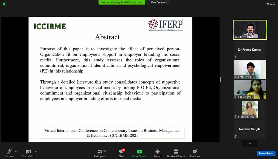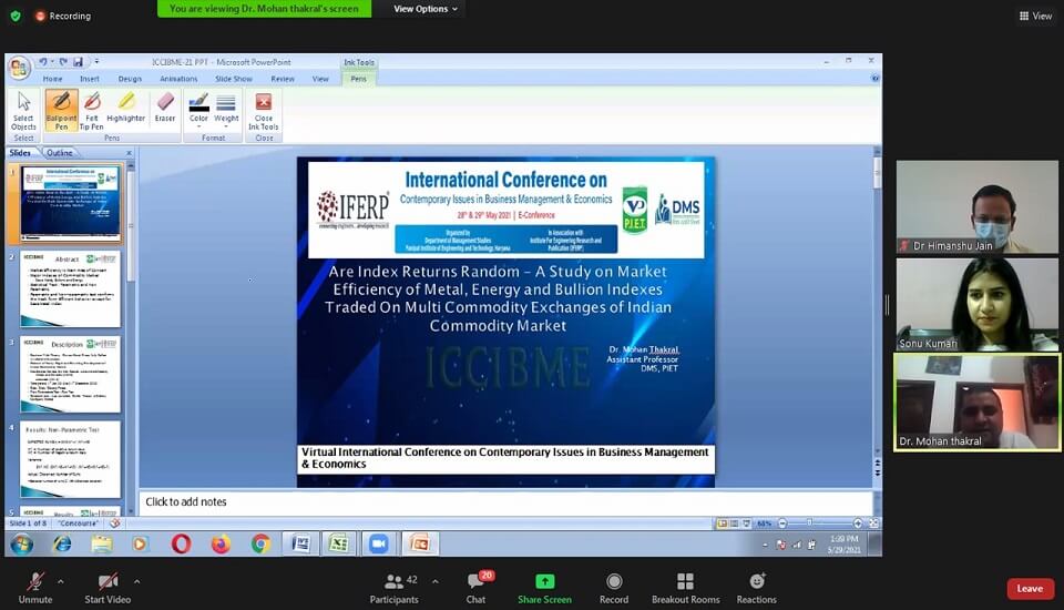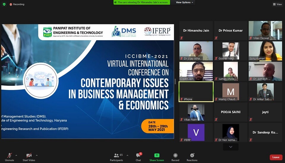 On 28th-29th May 2021, two days Virtual International Conference on Contemporary Issues in Business Management & Economics (ICCIBME-2021) was organized by Department of Management Studies, Panipat Institute of Engineering and Technology, Haryana in association with Institute for Engineering Research and Publication (IFERP). The main objective of this conference was to discuss the contemporary issues in Business Management and economics.