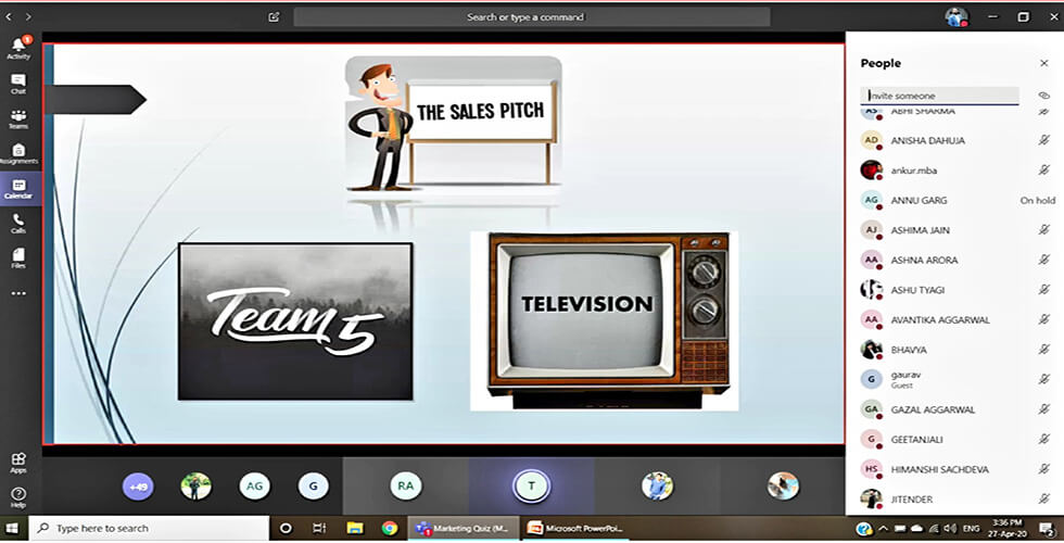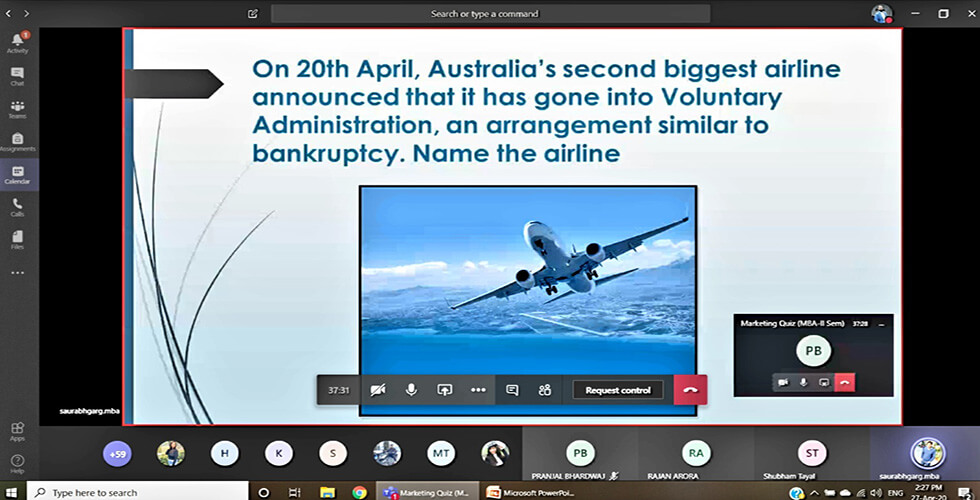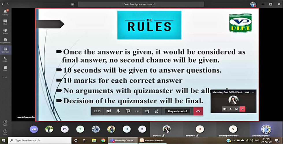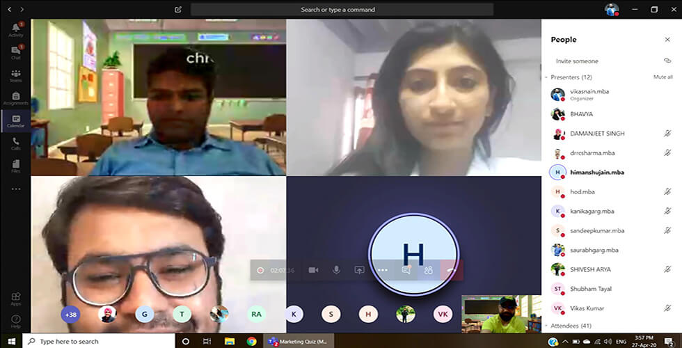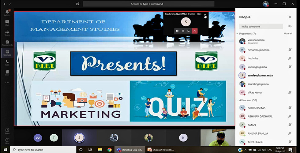 The Department of Management Studies organized a Quiz Competition, E-Quizzard (Marketing) on Microsoft teams on 27th April 2020. The Coordinators were Dr. Saurabh Garg, Mr. Vikas Nain and Mr. Vikas Kumar Tyagi. An online test was conducted in which 12 teams participated, six teams scoring highest was selected.